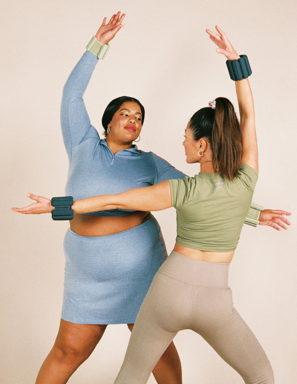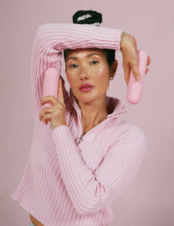 今回使用したのは、〈Balaバー〉と〈Balaバングル〉。〈Balaバー〉は、見た目のかわいさだけでなく、手になじむ素材感も魅力のひとつです。従来のダンベルのように手に負担がかかったり、匂いがついたりすることもなく、無理なく身体を動かすことができます。〈Balaバングル〉は、手首や足首に装着することで日常の延長線上にエクササイズを取り入れられるアイテムで、握る必要がない分、肩に余計な力が入らないのも特徴です。